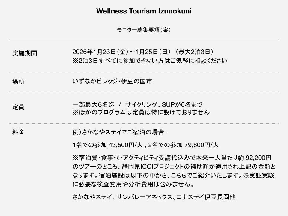 2026年4月以降で募集予定の伊豆の国市地域おこし協力隊への応募を考えている方、地方都市での新しい働き方を検討している方など、まずは温泉が大好きだったり、リトリートやウェルネスツーリズムに関心のある方、この地域や文化に関心がある方など、多様な方にご参加いただき地域を目いっぱい満喫しつつ、自身の心身の健康を考え、新しい時代の働き方を考えるきっかけつかみ取る機会になればと思います。